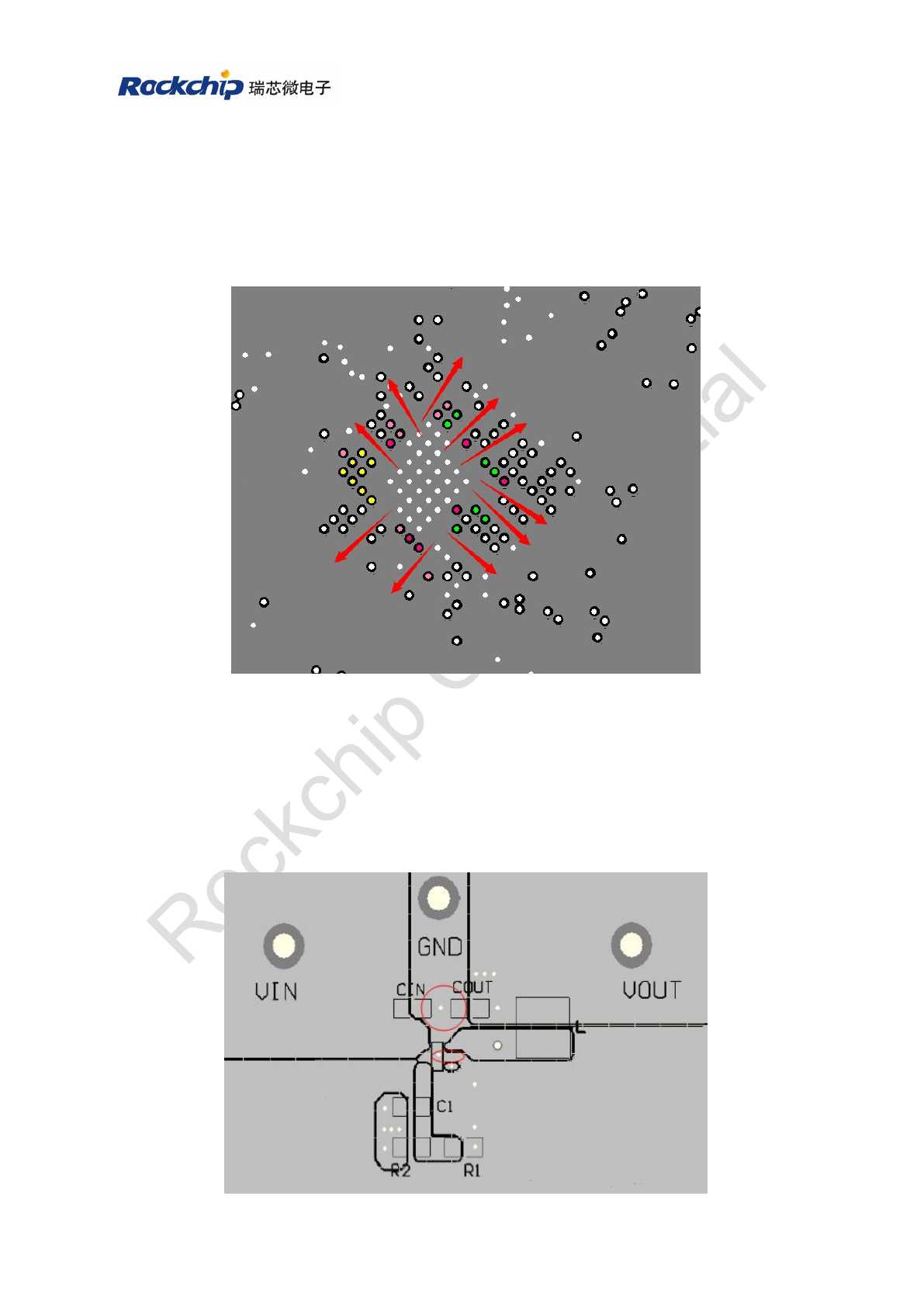 不能Vbus、Vdc、VCC_SYS等纹波较大的大电流信号灌铜邻层走线,分配的电容要靠近电源管脚放置。