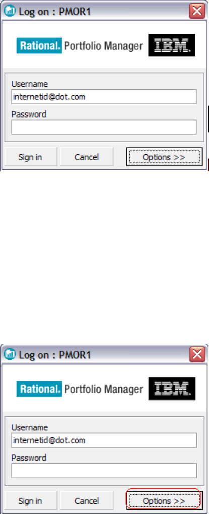 From the Rational Portfolio Manager Logon window, click the Options >> button.