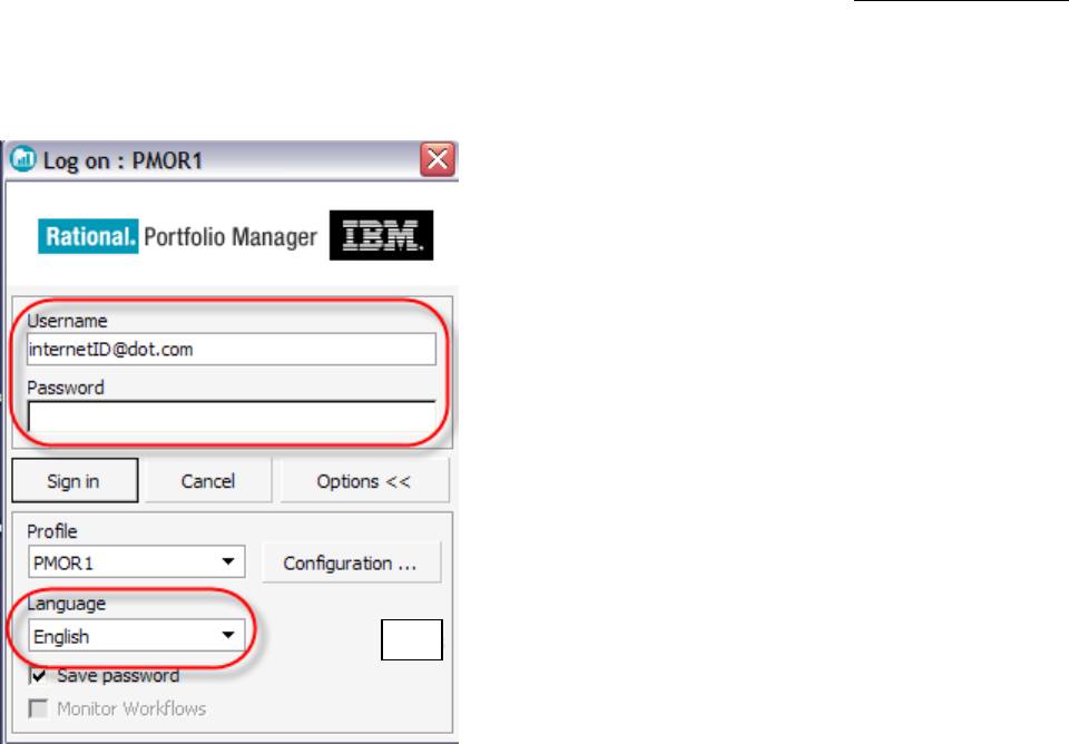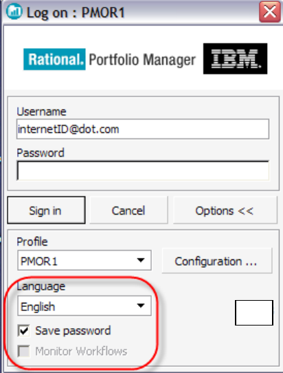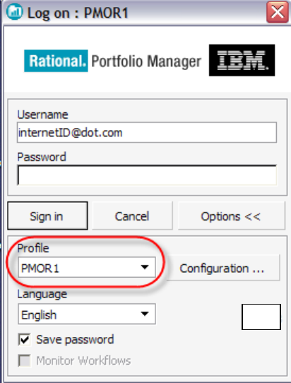 Or on the Logon window when first starting a Rational Portfolio Manager session: