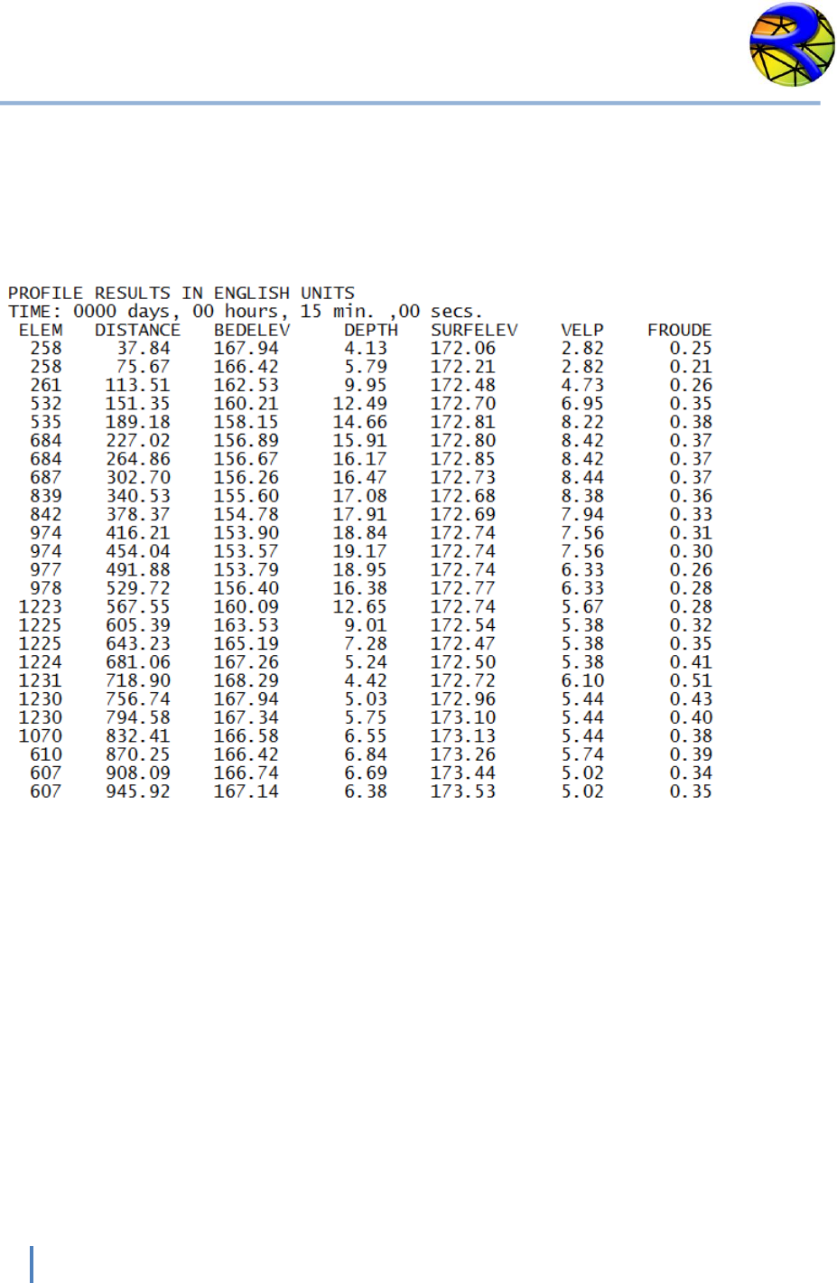 list bed elevation, depth, water surface elevation, depth average velocity, and Froude number.
