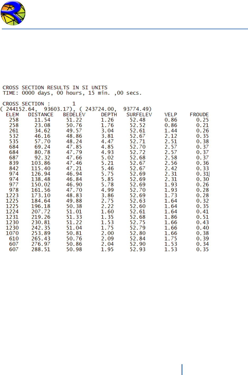 For output interval and for each user defined cross sections the bed elevation, depth, water
