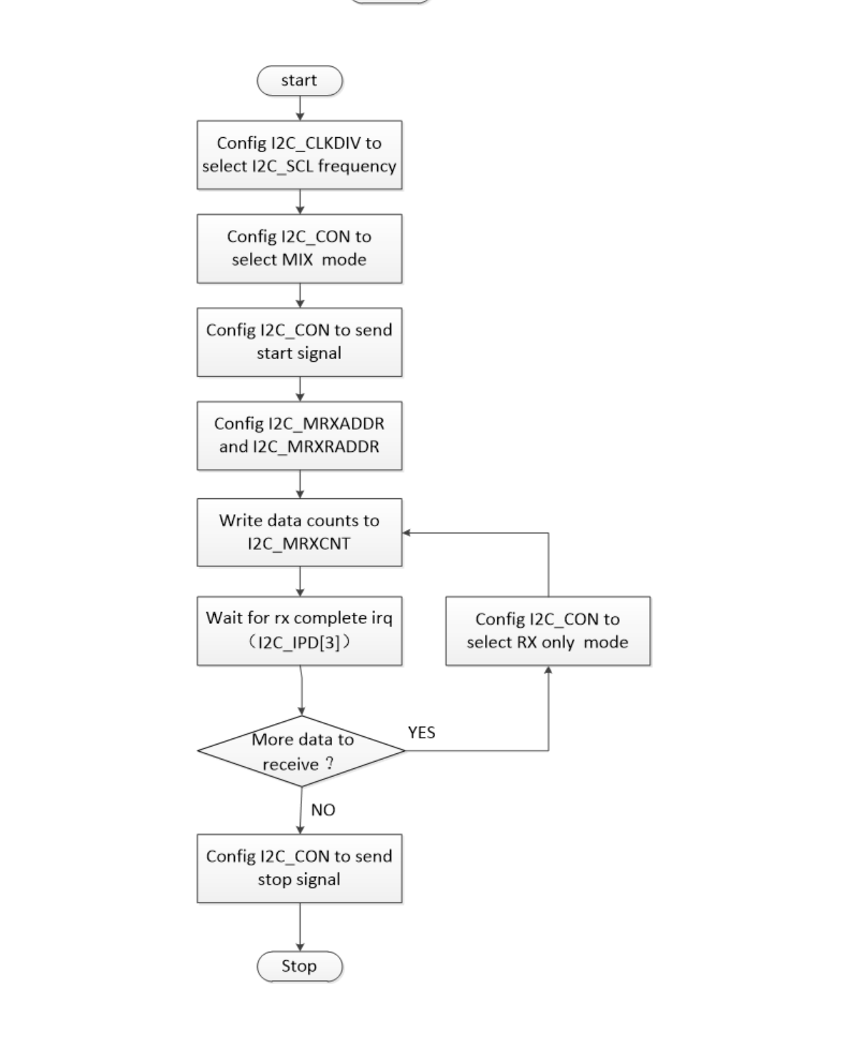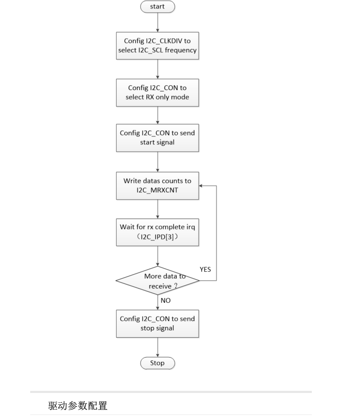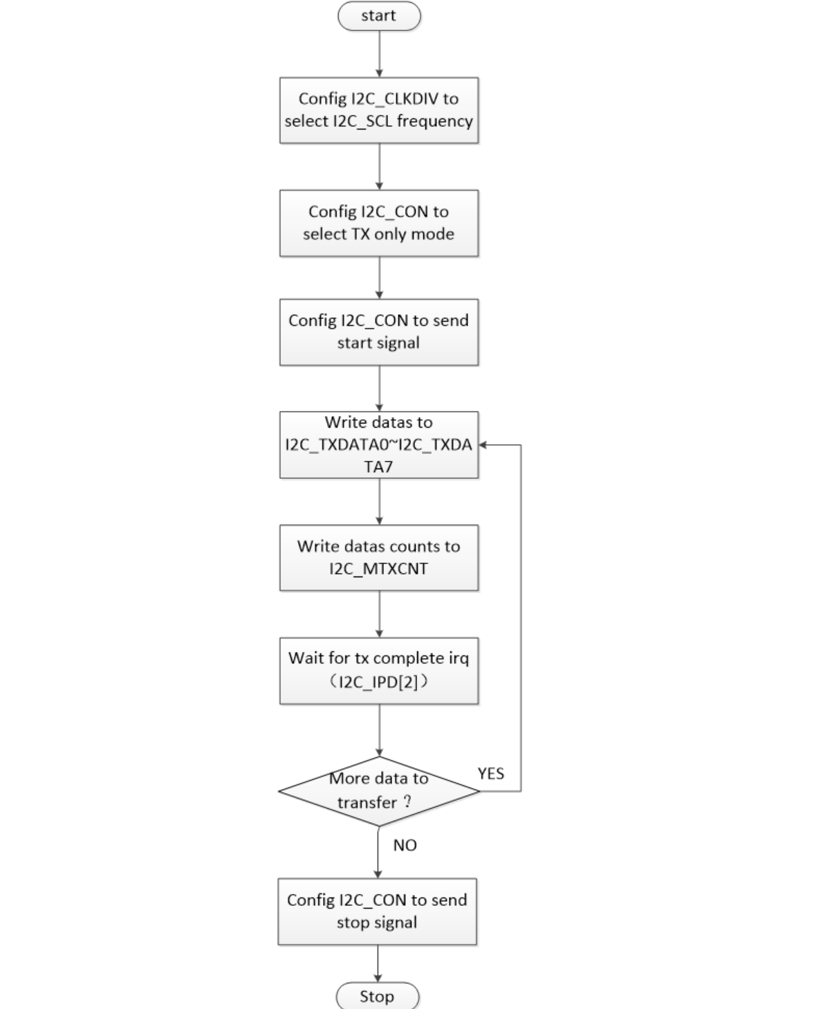 (I2C_CON[1:0]=2’b01)。下面的 I2C 控制器操作流程图是描述软件如何通过这个 I2C 控制器寄存器来配置和执行