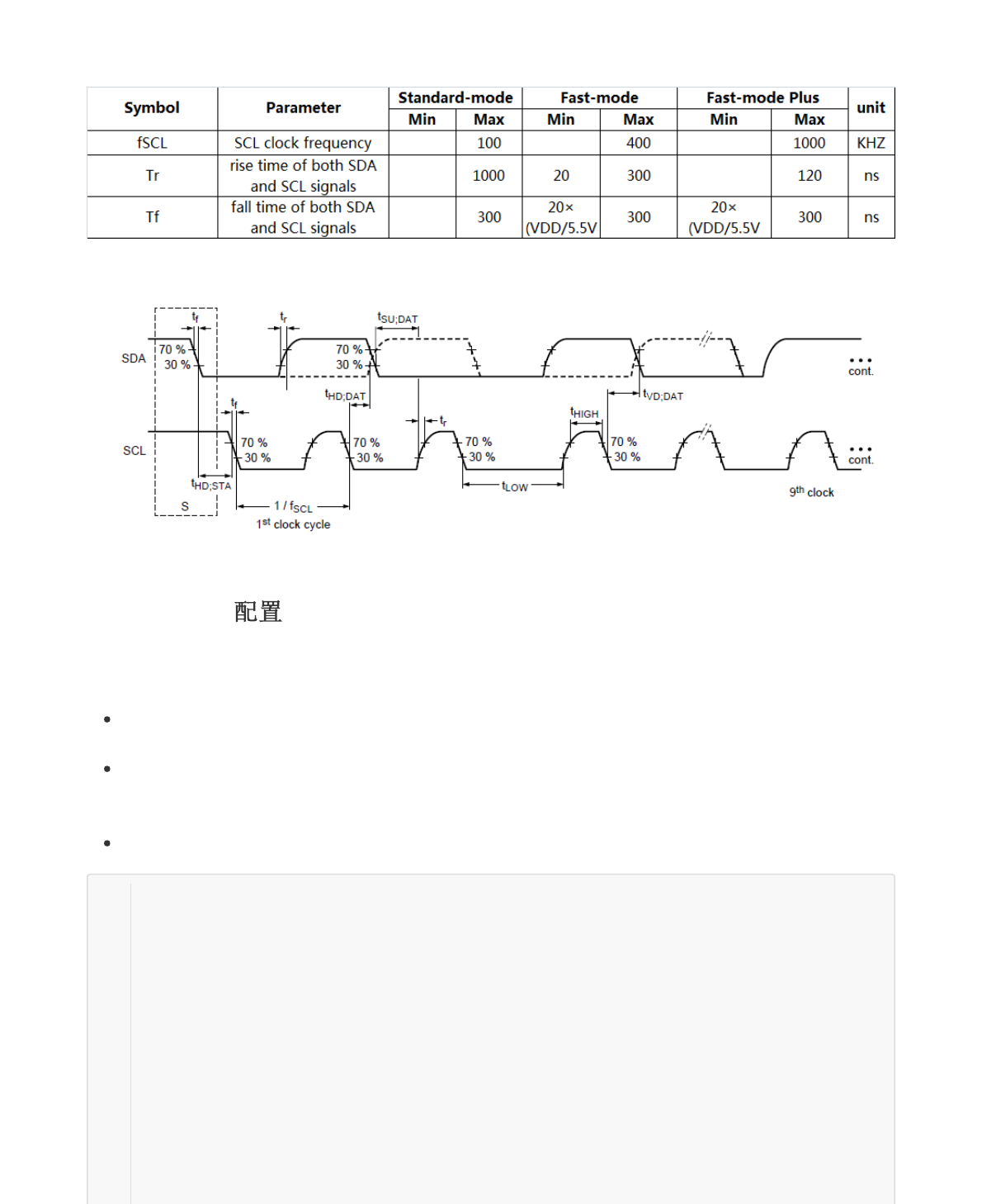 I2C 的参数配置最主要就是 I2C 频率的配置,可配 I2C frequency 除了与芯片有关外,主要是由 I2C SCL rise time
