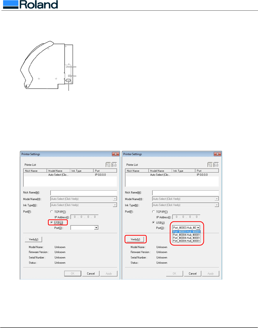 4. Select USB in Printer Settings, select the port from the Port list and click Verify.