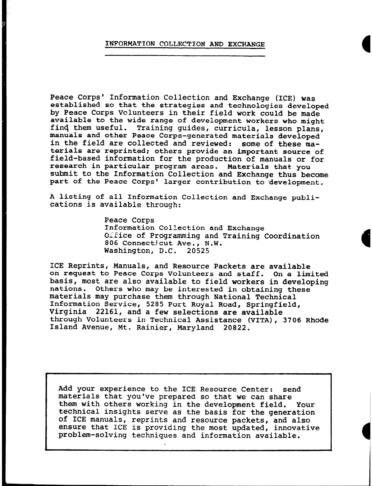 Peace Corps' Information Collection and Exchange (ICE) was