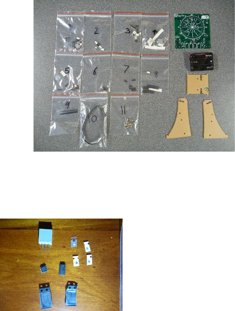 You should find 11 smaller bags, 1 PCB, 1 3xAA battery pack, and 3 pieces of acrylic. In the