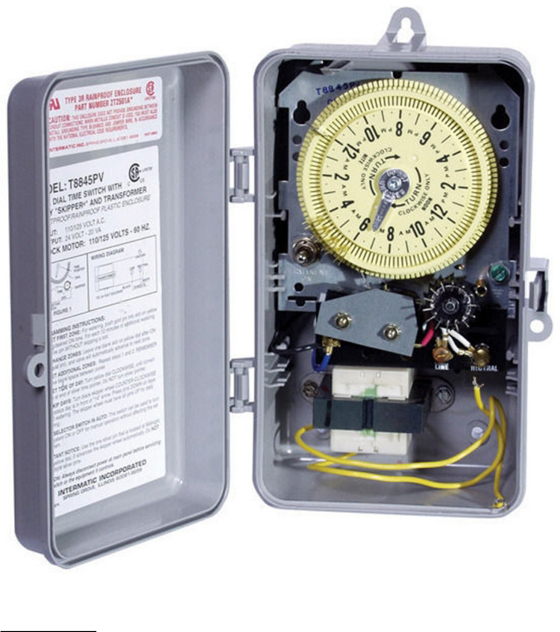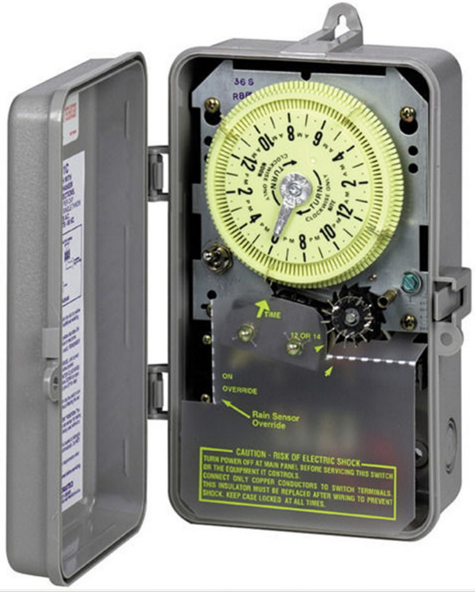 8) Timer comes in NEMA 3R Plastic raintight enclosure case with ½” and ¾” knockouts for electric wiring. Enclosure is not sold