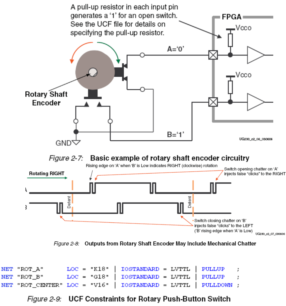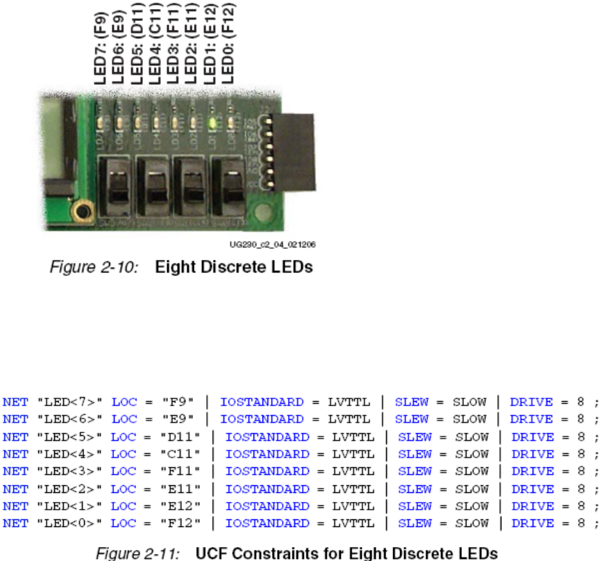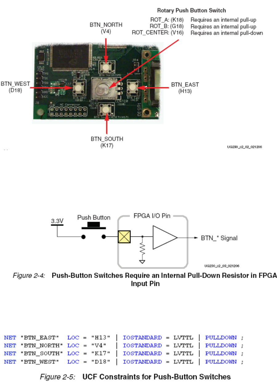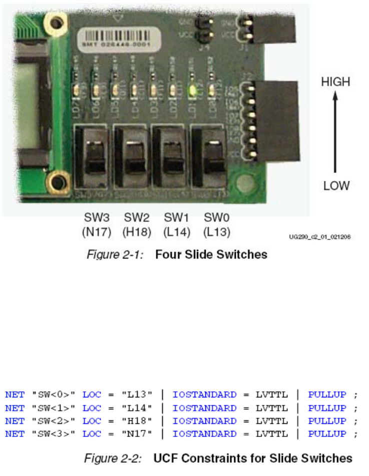 图2.2为4个滑动开关提供了UCF约束、I/O口分配和I/O口标准。这里没有用到上拉电阻。但