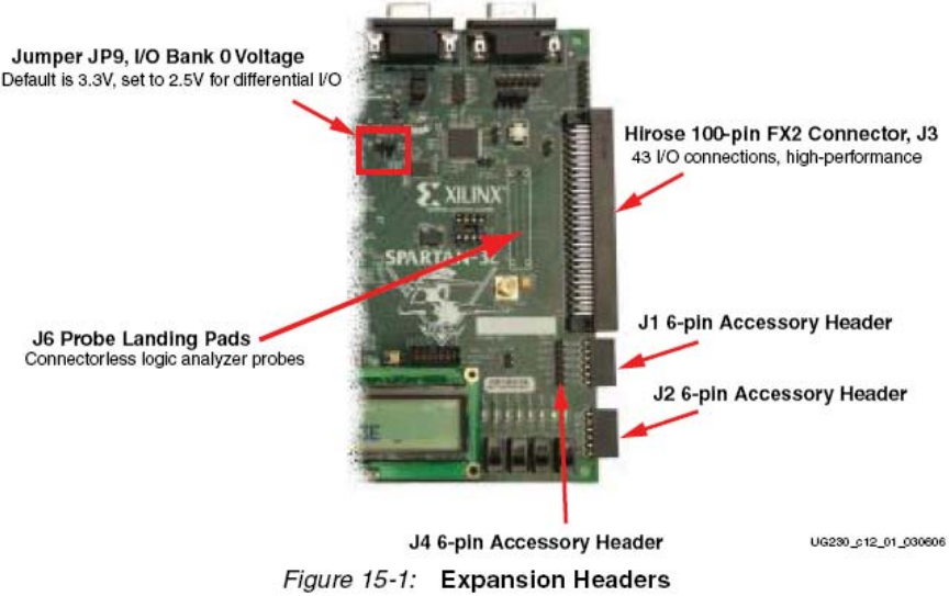 如图15.10所示,J4紧挨着J1。它采用0.1英尺圆心桩脚组成6管脚连接器。4个FPGA管脚