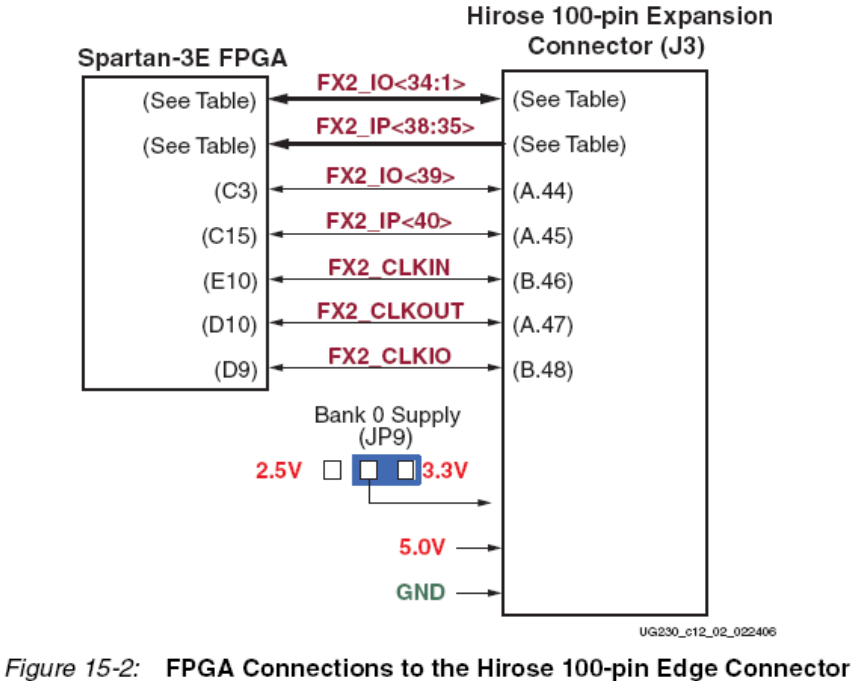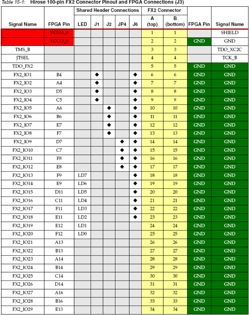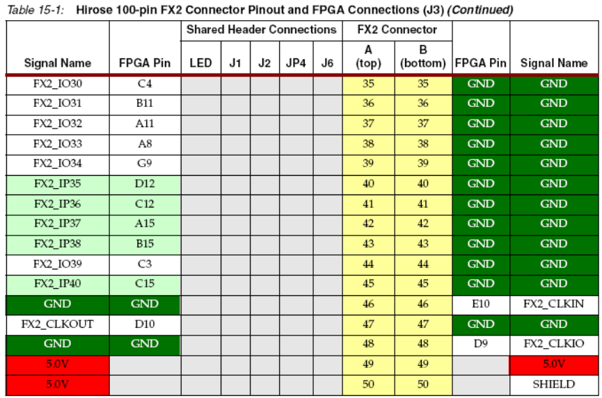 表15.1给出了100管脚hirose FX扩展连接器输出管脚与FPGA管脚的连线。FX2有2排连接