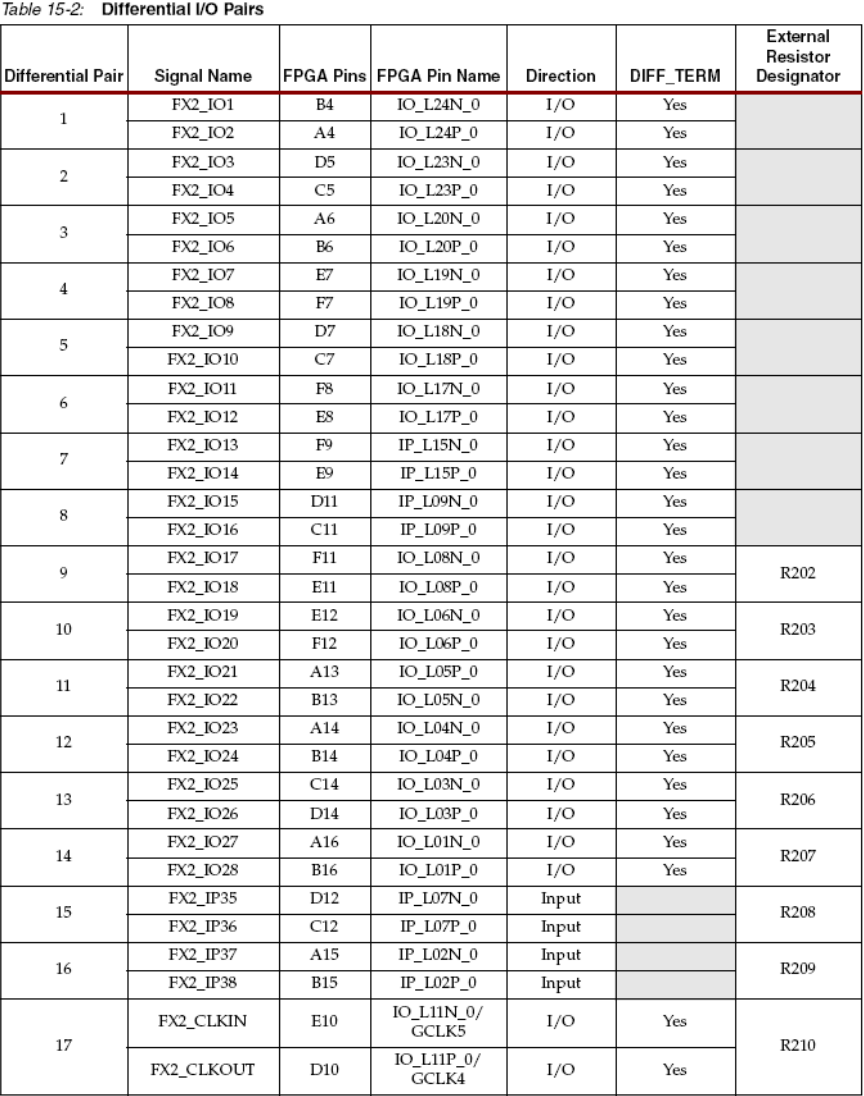 FX2、J3支持高达15个差分I/O对和两对采用LVDS或RSDS I/O标准的只输入对,见表15.2