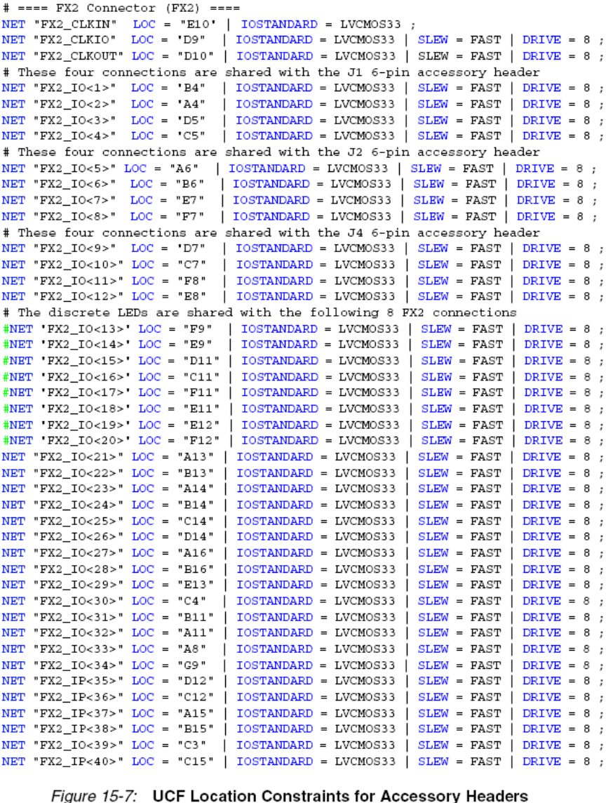 图15.7给出了FX2连接器管脚的UCF约束。