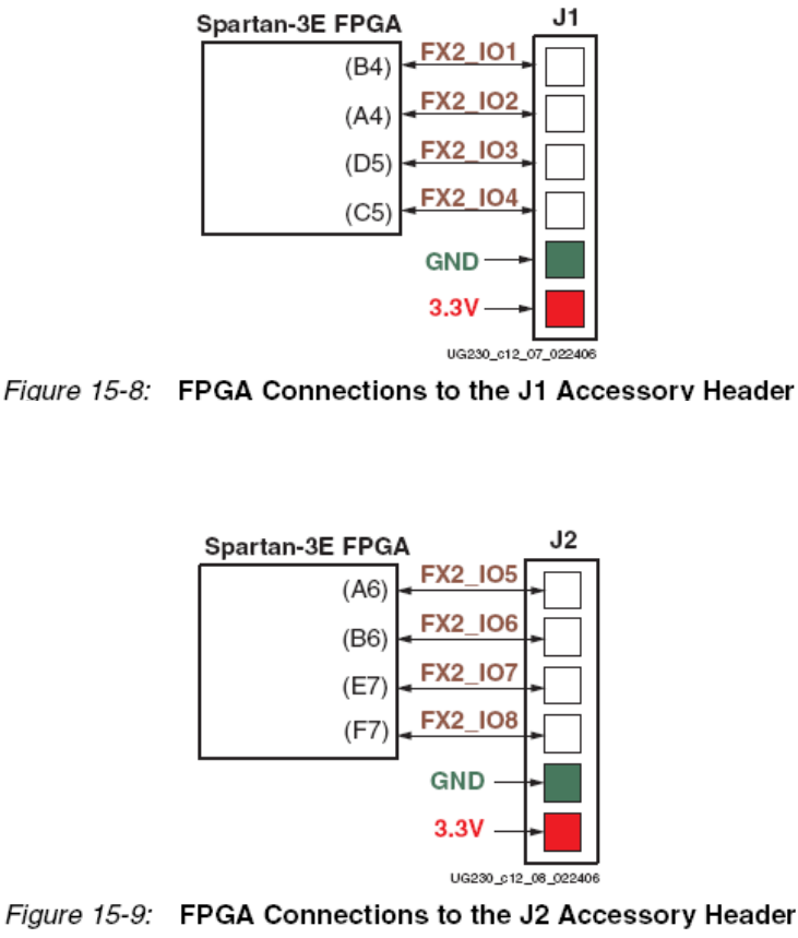 4个FPGA管脚(FX2_IO<8:5>)连接到J2。这四个信号与FX2连接器复用。实验板向贴在J2的