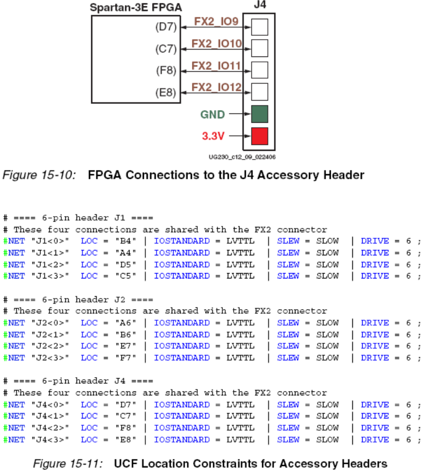 4个FPGA管脚(FX2_IO<4:1>)连接到J1。这四个信号与FX2连接器复用。实验板向贴在J1的
