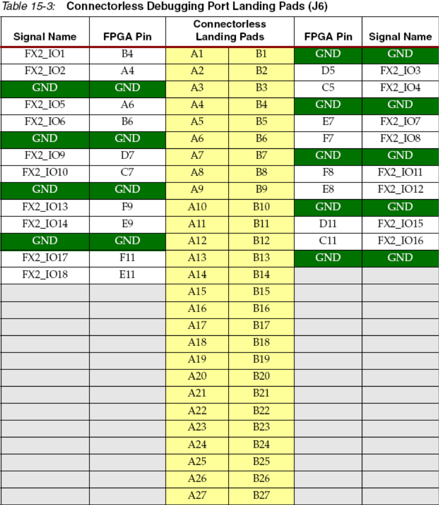 表15.3给出了连接器的输出管脚。只有18个FPGA管脚连接到连接器上,连接器上的其它