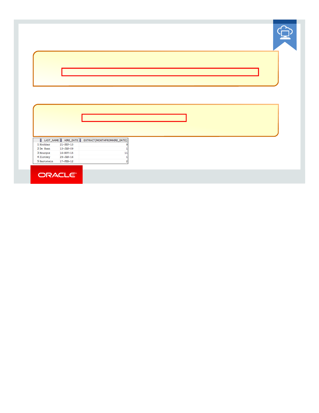 This lesson addressed some of the datetime functions available in the Oracle database.