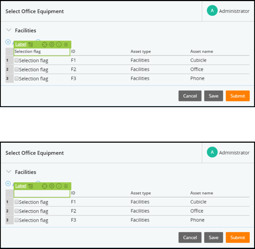 55. In the selection identifier, click the Gear icon to open the Cell Properties panel for the column label.
