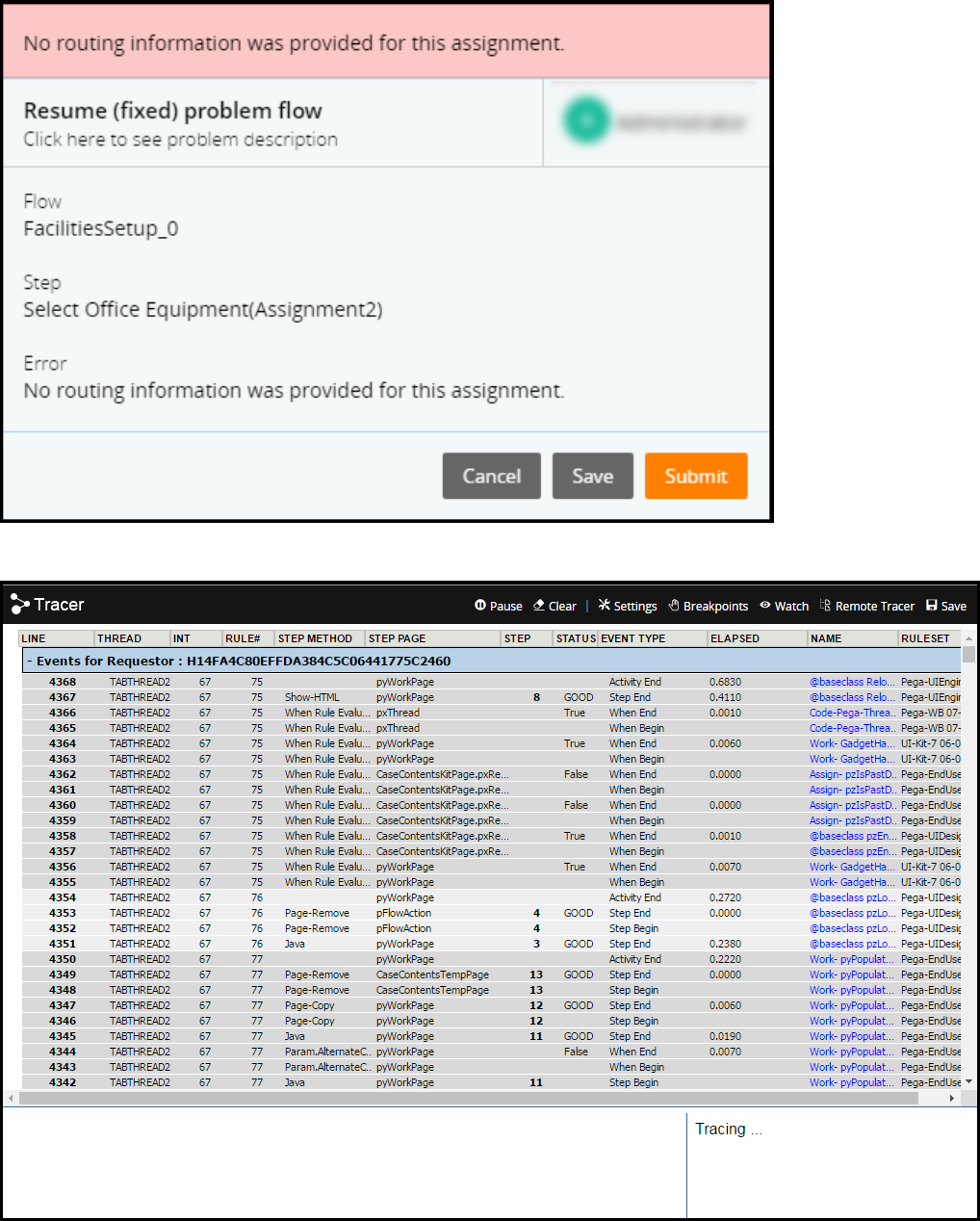error.Review the Tracer output to determine the source of the error and identify if a fix is needed.