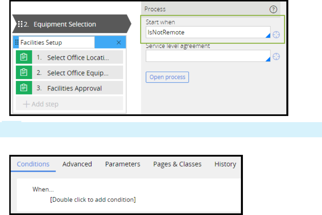 3. In the Process Properties panel, click Open process to open the Facilities Setup flow rule.