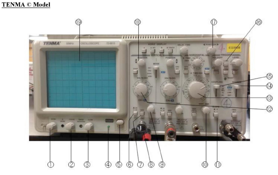 Figure B.7. You must then adjust the position (18), volts/div (12), and time/div (13) knobs