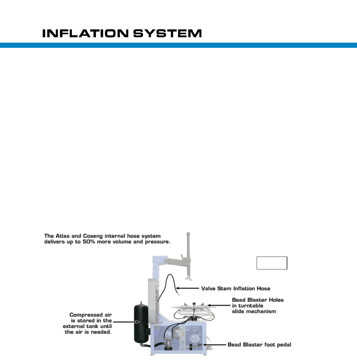 TIRE CHANGER. COMPRESSED AIR IS STORED IN THE INFLATION TANK AND