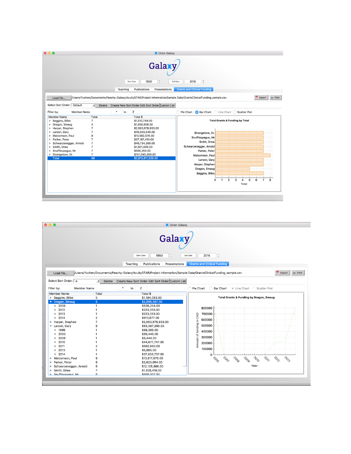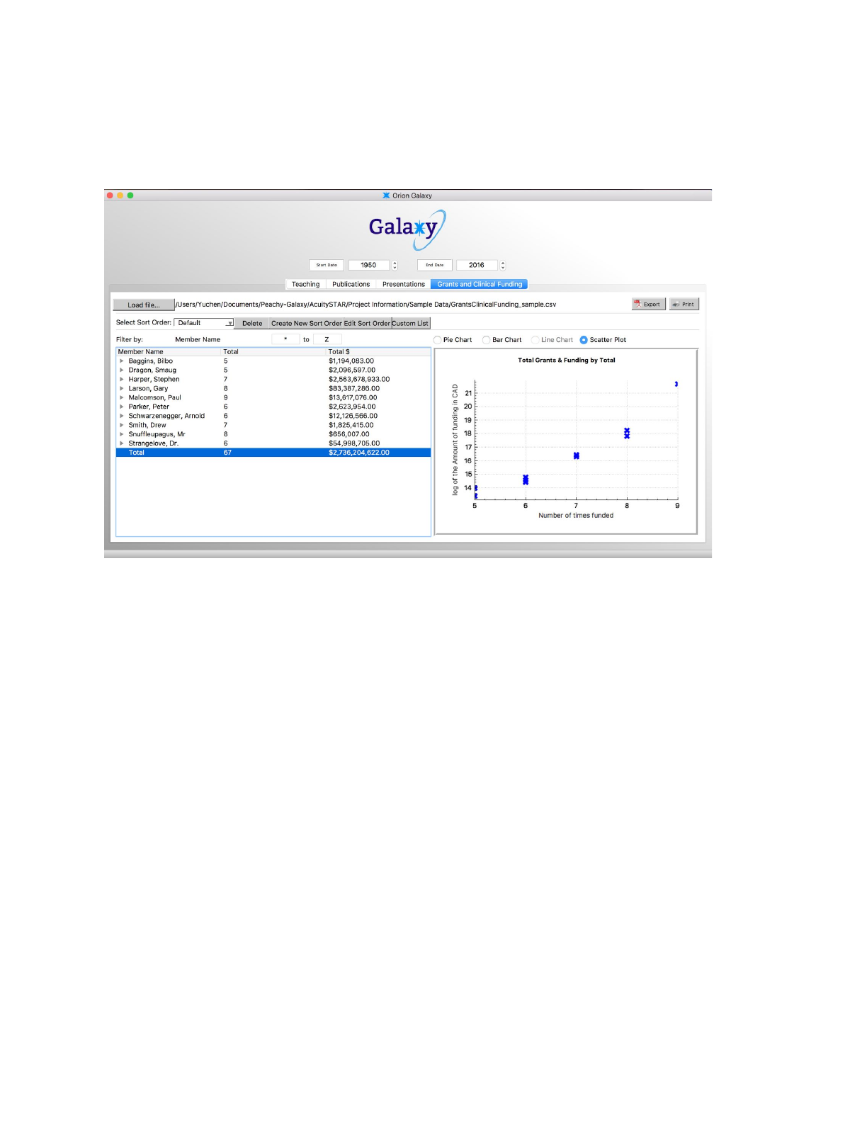 If you click total in Grants and Clinical Funding tab, the scatter plot option will be available,
