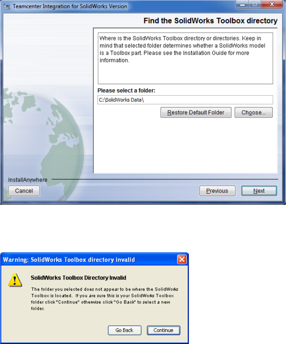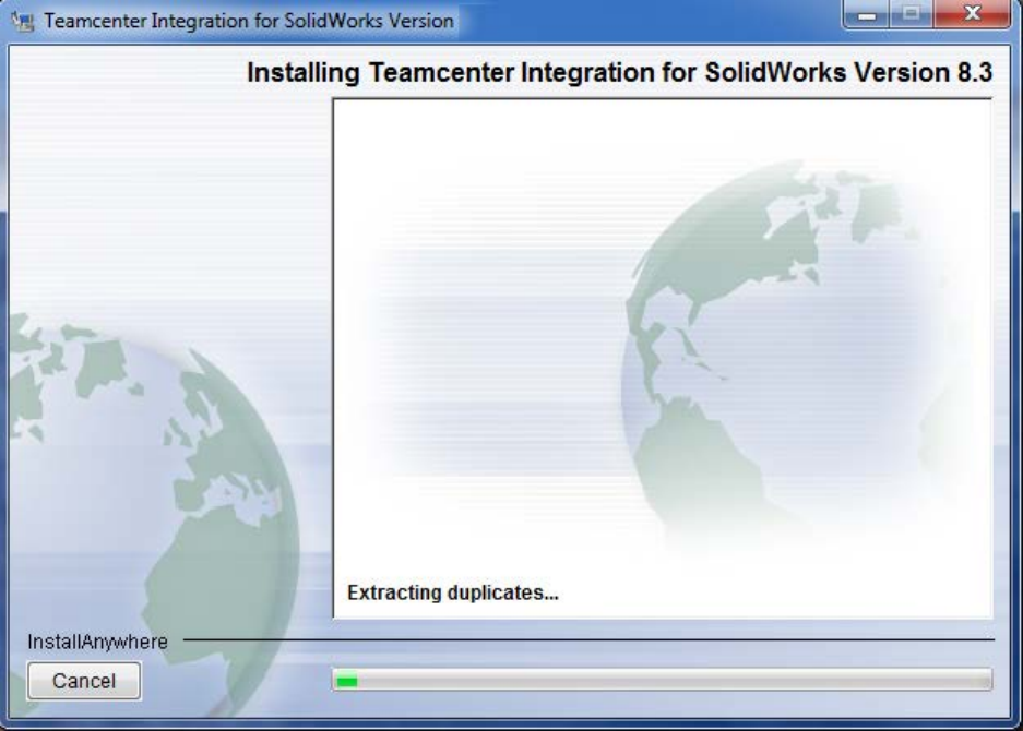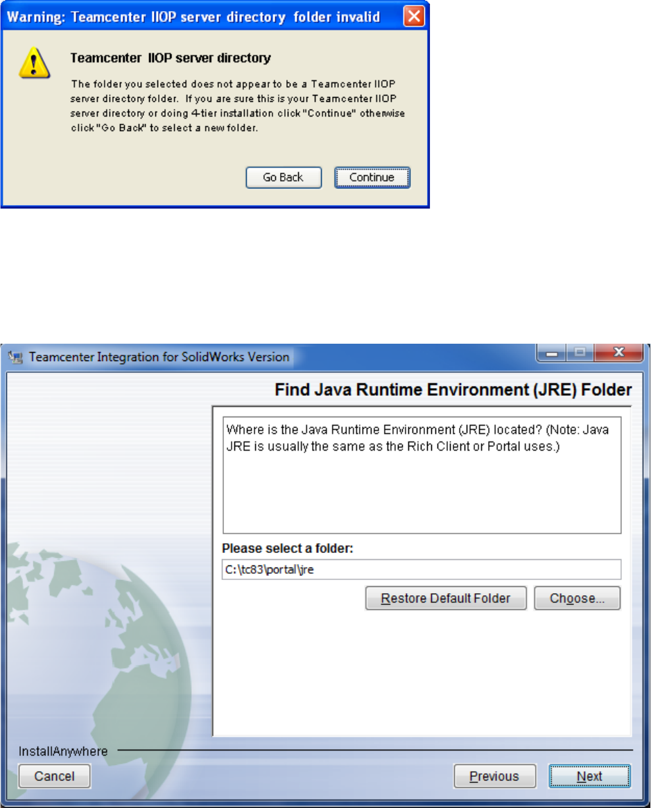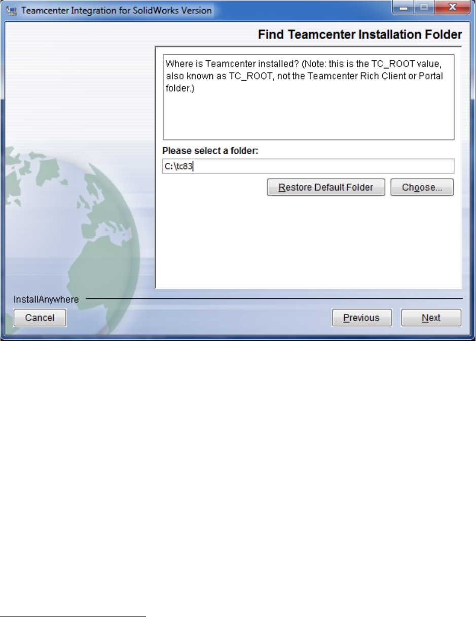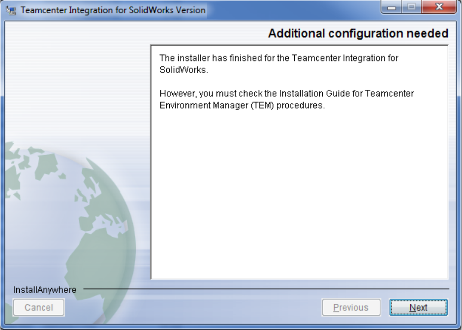 • If you receive the message, “Installation of the Teamcenter Integration for SolidWorks is