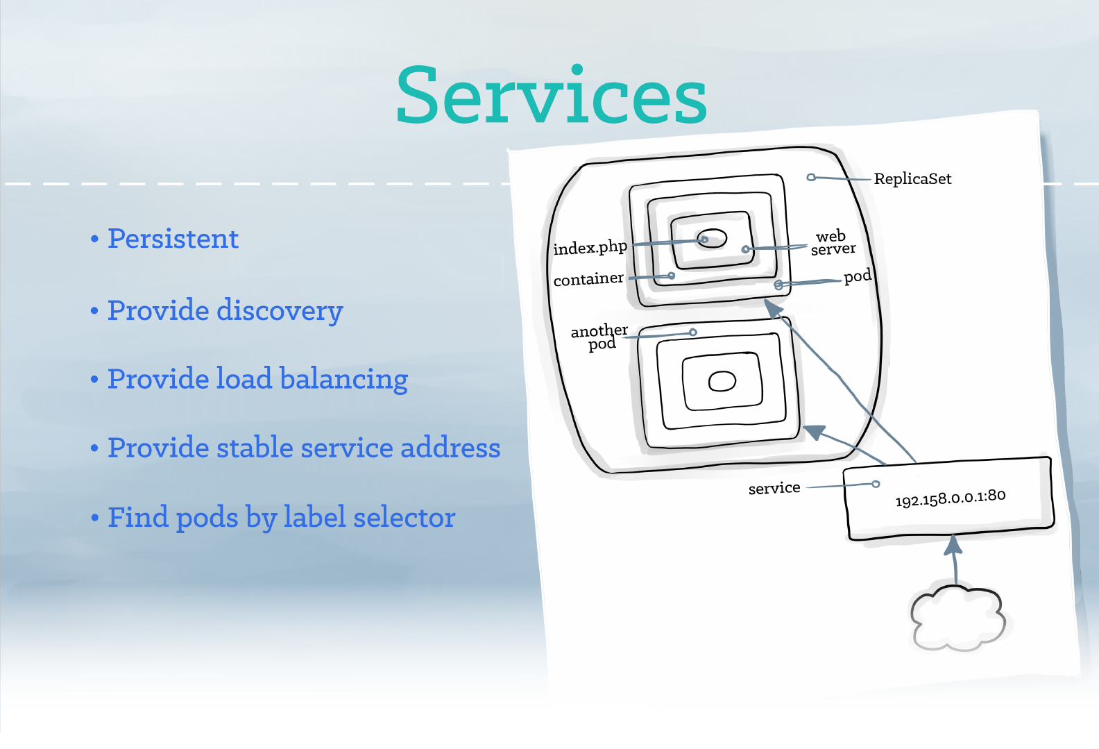 your application provides. While pods come and go, the service IP addresses and ports remain the same. Other