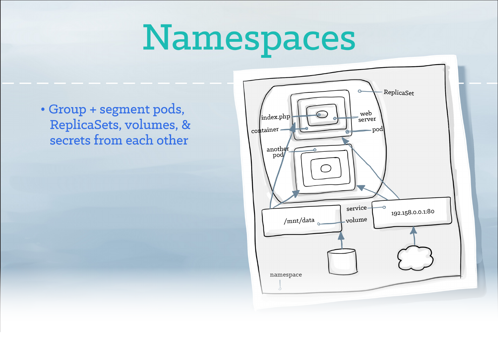 A namespace functions as a grouping mechanism inside of Kubernetes. Services, pods, ReplicaSets, and volumes
