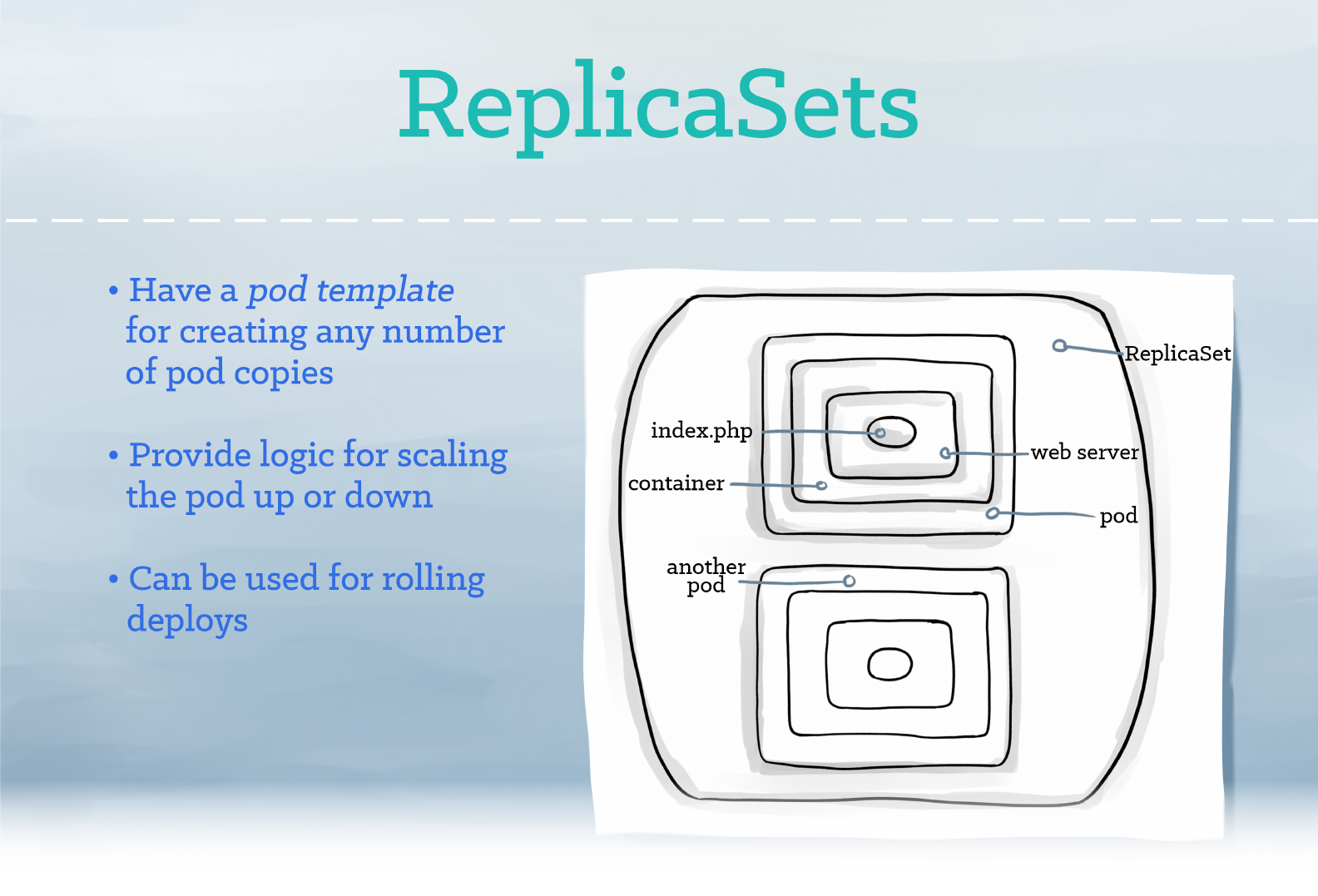 ReplicaSets provide a method for managing an arbitrary number of pods. A ReplicaSet contains a pod template,