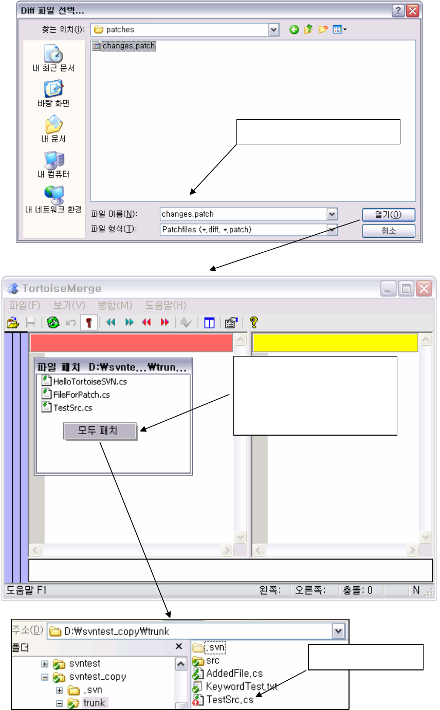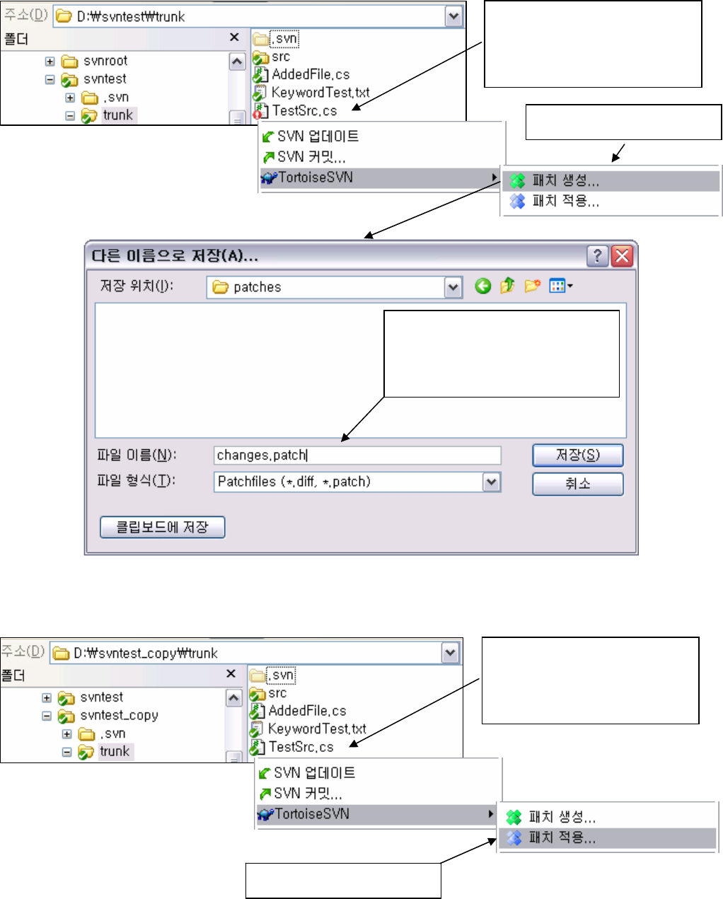 관리자는 패치를 받은 후 아래와 같이 패치생성에 사용된 폴더와 동일한 폴더 안에서 TortoiseSVN -> 패치