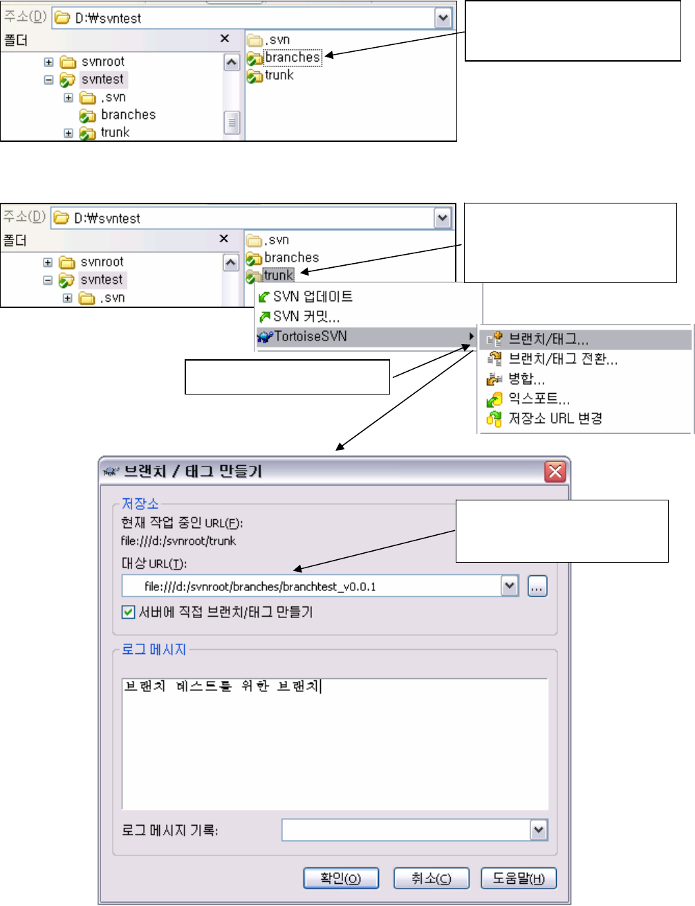 고자 할 때 사용합니다. 브랜치는 관례에 따라 저장소의 루트 폴더 아래의 branches라는 폴더에서 관리됩니