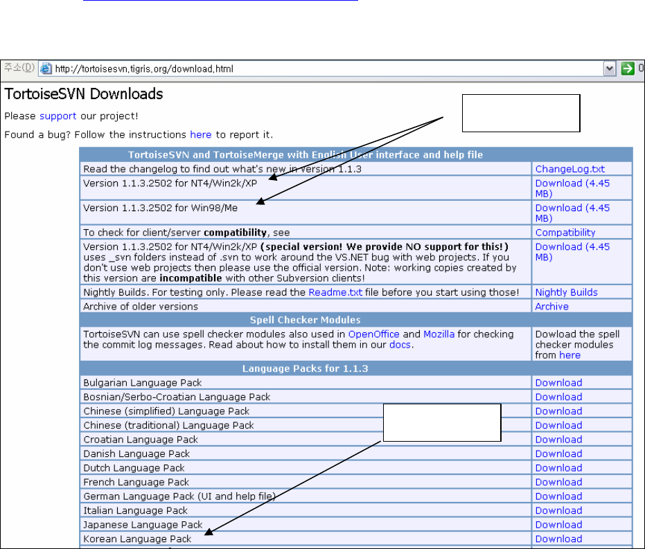 TortoiseSVN은 http://tortoisesvn.tigris.org/download.html에서 TortoiseSVN 설치프로그램과 한글 언어팩을