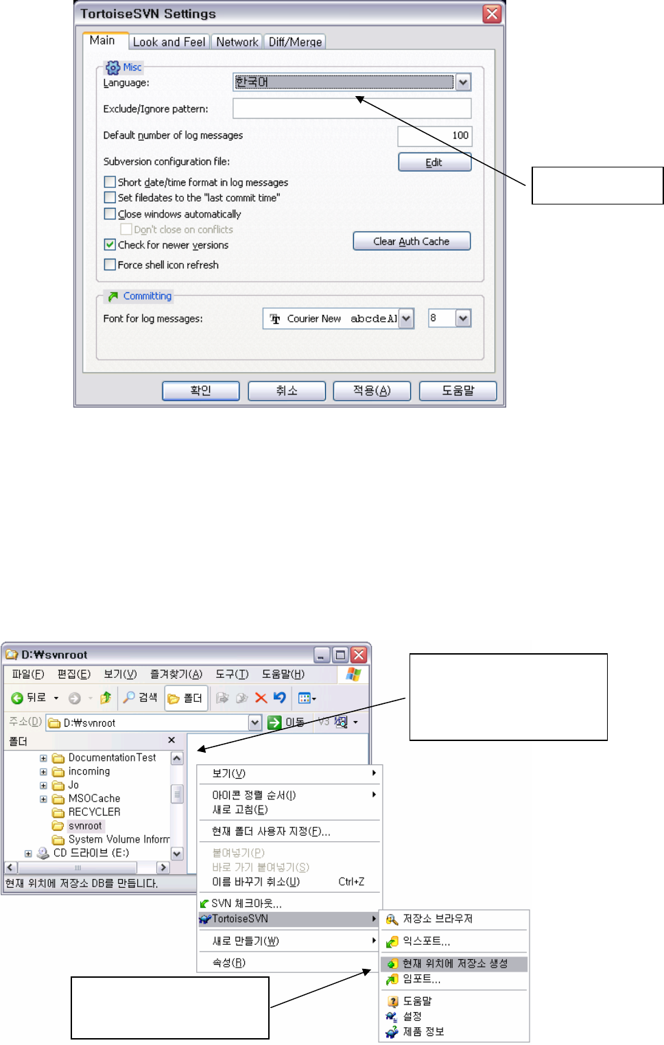 TortoiseSVN의 한글 언어팩을 설치하였다면, 다음과 같이 언어를 한글로 설정할 수 있습니다.