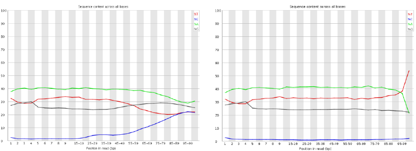 start of reads to around 22% (!) towards the end of reads. Adapter trimming with
