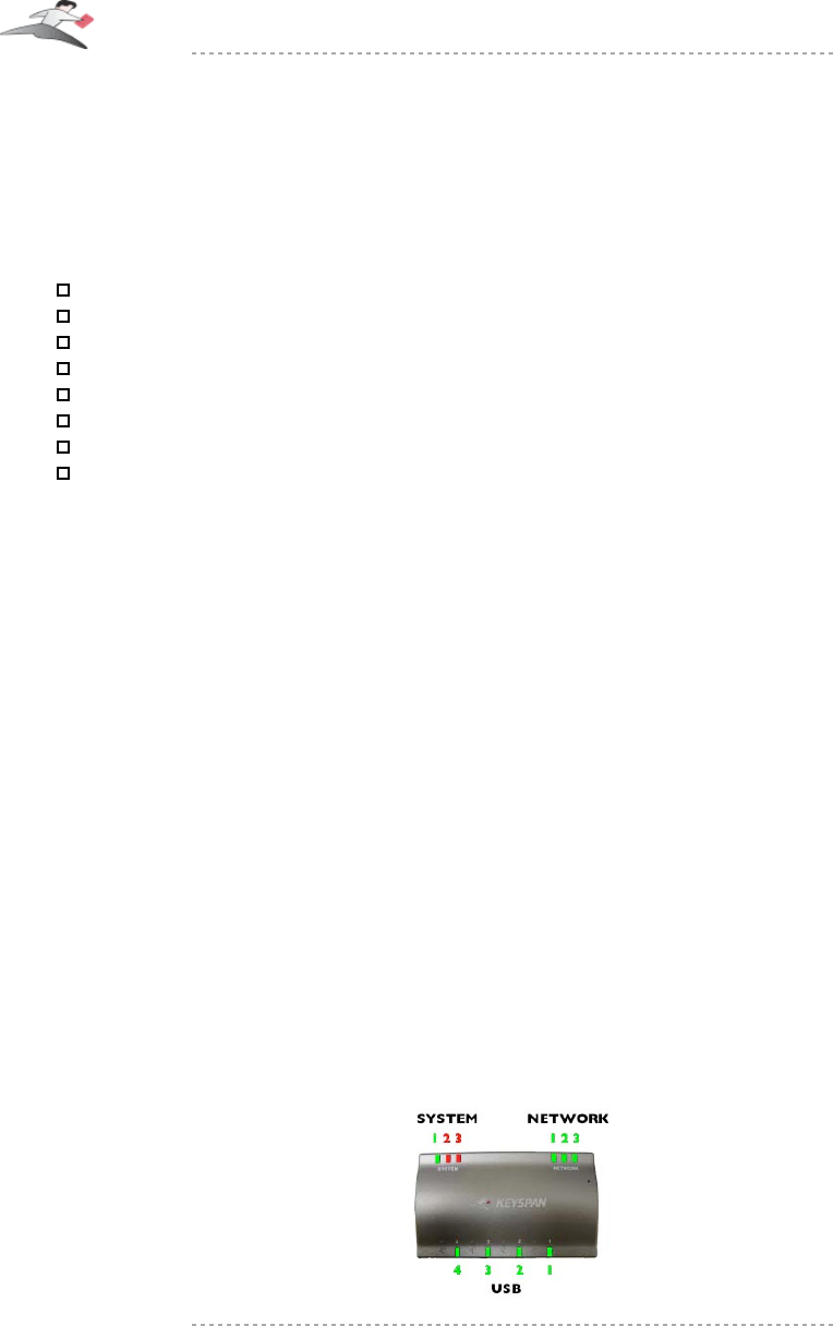 The Keyspan USB Server provides the following connections to your Network: