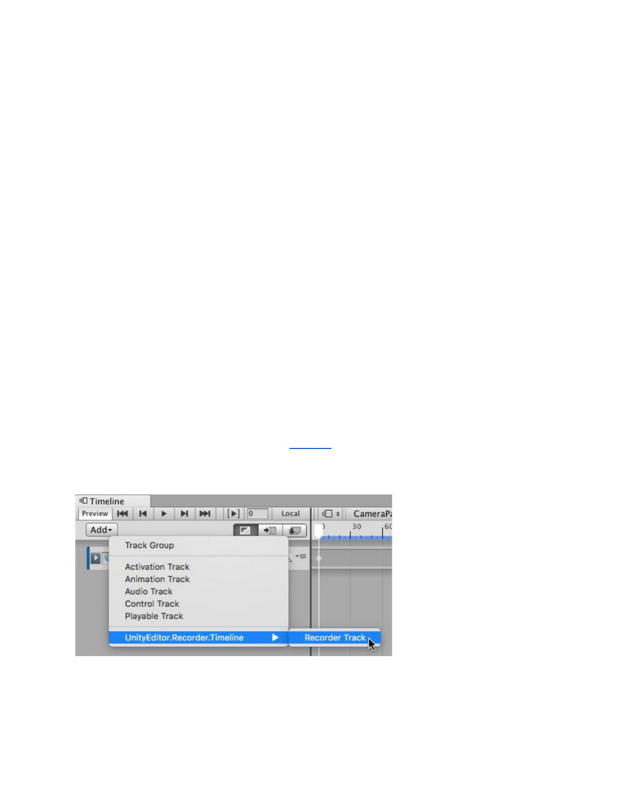 The Unity Recorder also supports Timeline. Use Recorder tracks and clips to trigger recording