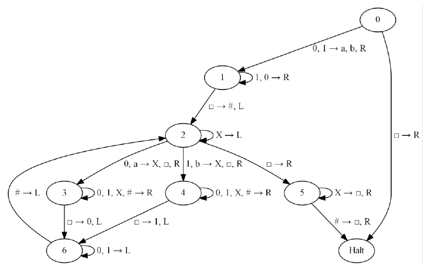 •-1 denotes a halt-and-accept state, -2 is a halt-and-reject state, and -3