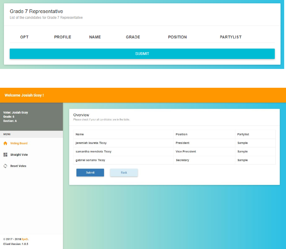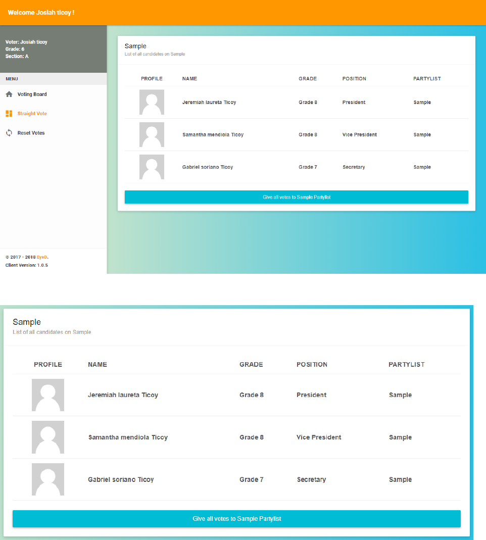 Sample candidate, where you can view their names, the position and the option.