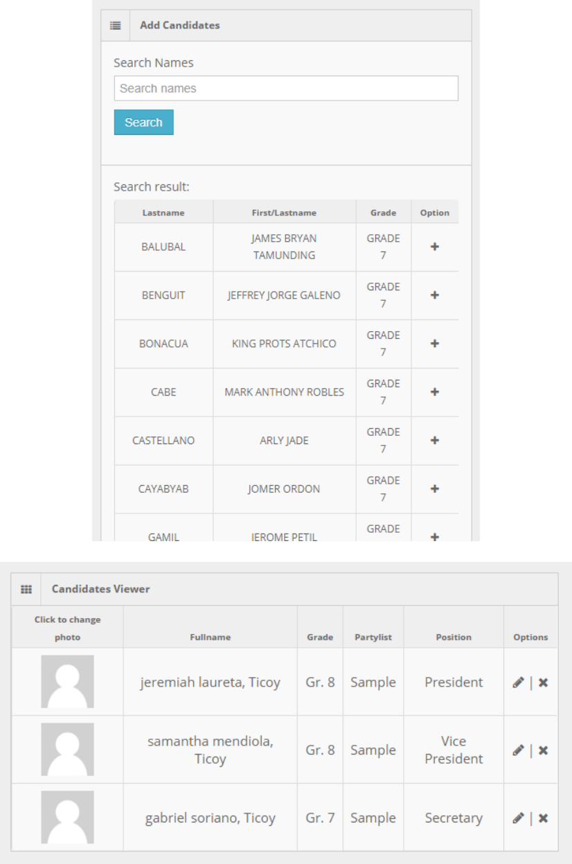 Candidates viewer, where you can edit and remove. you can also add their profile photo by