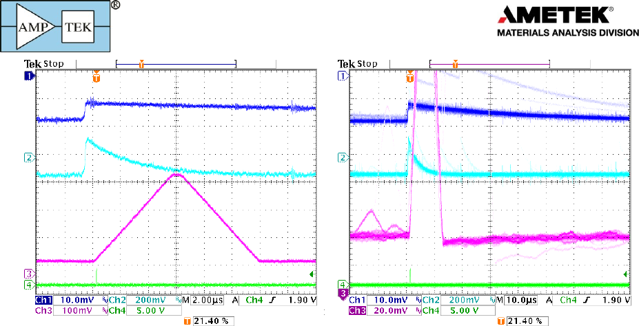 Preamplifier output. These traces also shows the preamp output but on a different voltage and time scale to illustrate the