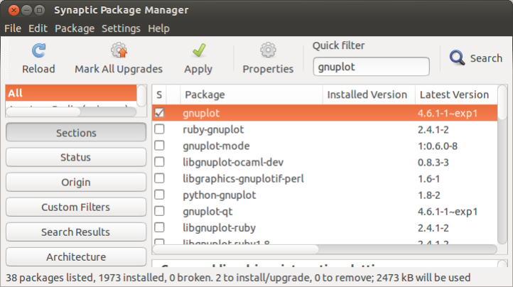 •Open Synaptic Package Manager and type gnuplot in Quick Filter search.