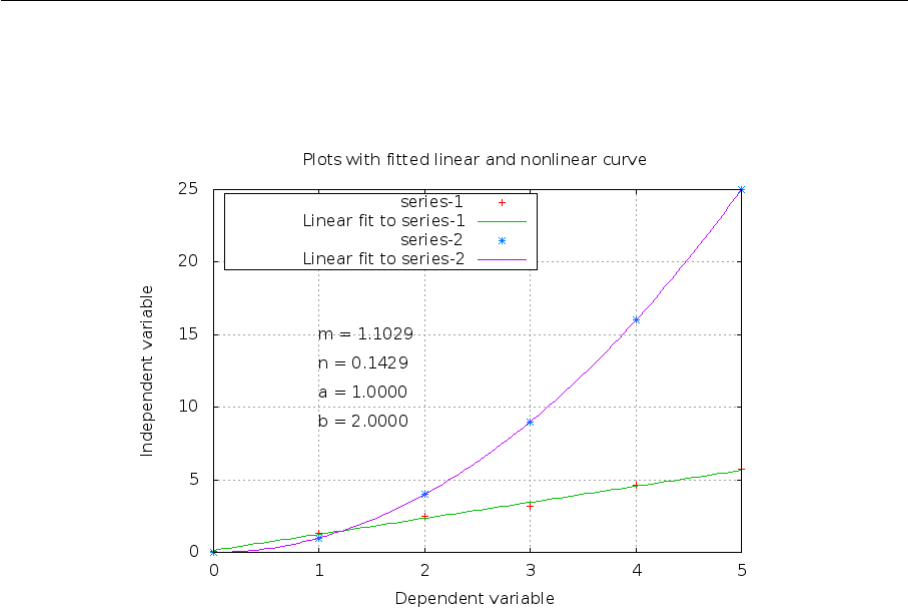 plot "test.dat" using 1:2 title ‘series-1’, f(x) title ‘Fit to series-1’,