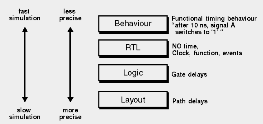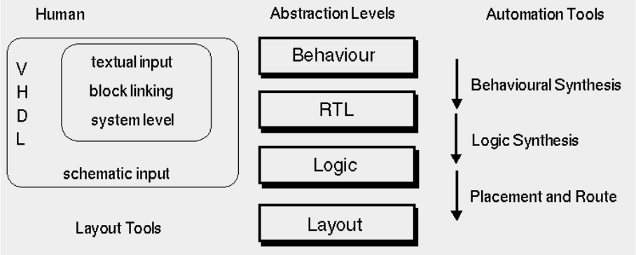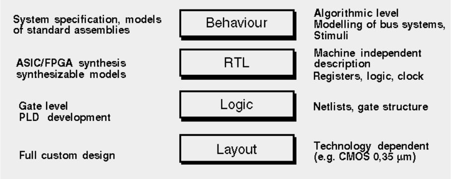 - VHDL üstteki üç soyutlama seviyeleri için uygulanabilir. VHDL bir yerleşim tanımlamaya uygun değildir. Davranışsal ve RT seviyedeki tasarım girişi genellikle metin editörleri tarafından yapılır. Grafik araçları da mevcuttur ancak deneyimli kullanıcı...