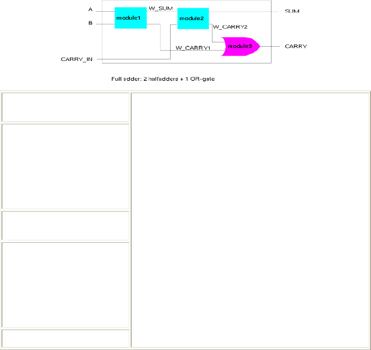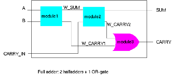 - Yukarıda, bir tam toplayıcı(full adder), iki yarım toplayıcıyı(half adder) ve bir VEYA(OR) kapısını içerecek şekilde adım adım oluşturulmuştur. Kendimizi tamamen yapısal bir tasarımla kısıtlamaktayız, örneğin kapı seviyesi tanımlama kullanıyoruz ve ...