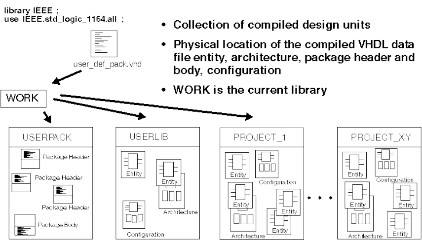 - Bir kütüphanede tüm incelenmiş objeler yani paketler, paket gövdeleri, varlıklar, mimariler ve konfigürasyonları bulabilirsiniz. VHDL ‘de kütüphane, derlenmiş objelerin grup halinde bulunduğu ve referans verilebildiği mantıksal isimdir. Varsayılan k...