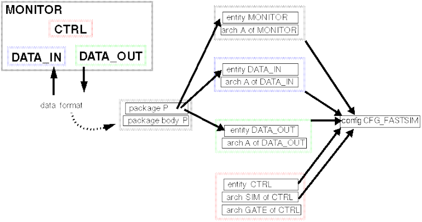 - Örnekte görüldüğü gibi tasarım dört modelden oluşmaktadır. En üstte MONITOR modülü bulunmaktadır, bu da üç alt modülü kullanmaktadır. Bunlar; CTRL, DATA_IN ve DATA_OUT alt modülleridir. Verinin formatı için olan veri tipleri package P de tanımlanmış...
