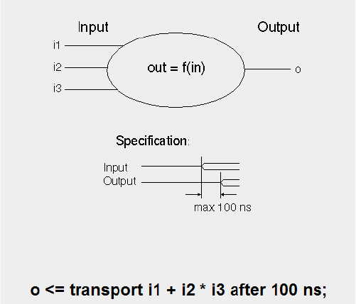 - Bir modelin basit bir belirtim(specification) fonksiyonu gösterilmiştir. Çıkış üç giriş değeri i1, i2 ve i3 ‘e bağlıdır.Ayrıca yeni çıkış değeri giriş değeri değiştirildikten sonra 100ns sonunda hazır olmalıdır. Bir davranışsal VHDL tanımlamada, f...