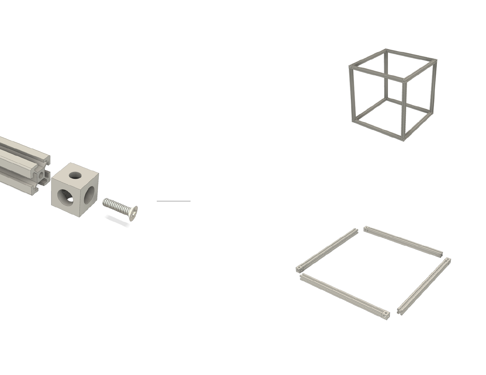 Step 1: Pre-assemble 8 extrusions by attaching a corner cube to one of the ends. Use