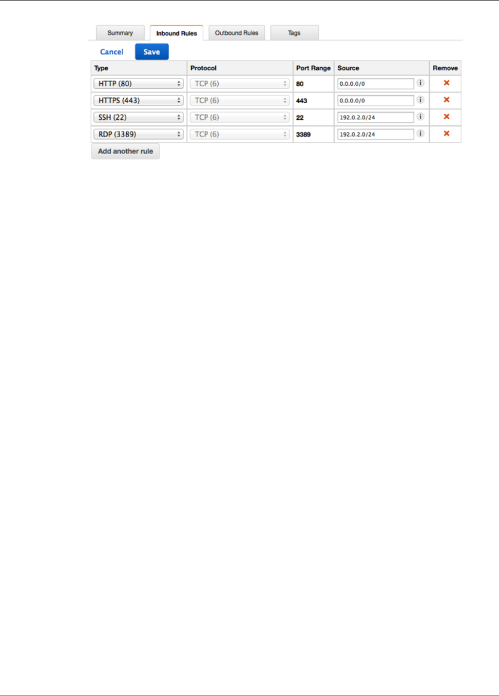 7. On the Inbound Rules tab, choose Edit and add rules for inbound traffic as follows, and then choose